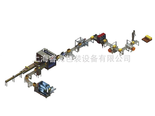 成品通过输送生产线进行理瓶整理→转向排序→加速缓冲→再以一定的数量自动有序的装入纸箱→全自动封箱机构按要求封好纸箱→自动捆扎机进行捆扎带→最后由物流线输出到码垛机和托盘库、自动缠绕膜机工位。