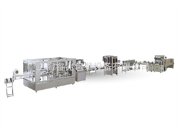 The fruit wine filling line is composed of an automatic bottle washing machine, a filling machine, a sealing integrated machine, an automatic capping machine, an automatic cap sorting machine, a light inspection machine, a sleeve label shrinking machine, a cuff packaging shrinking machine and a conveyor.